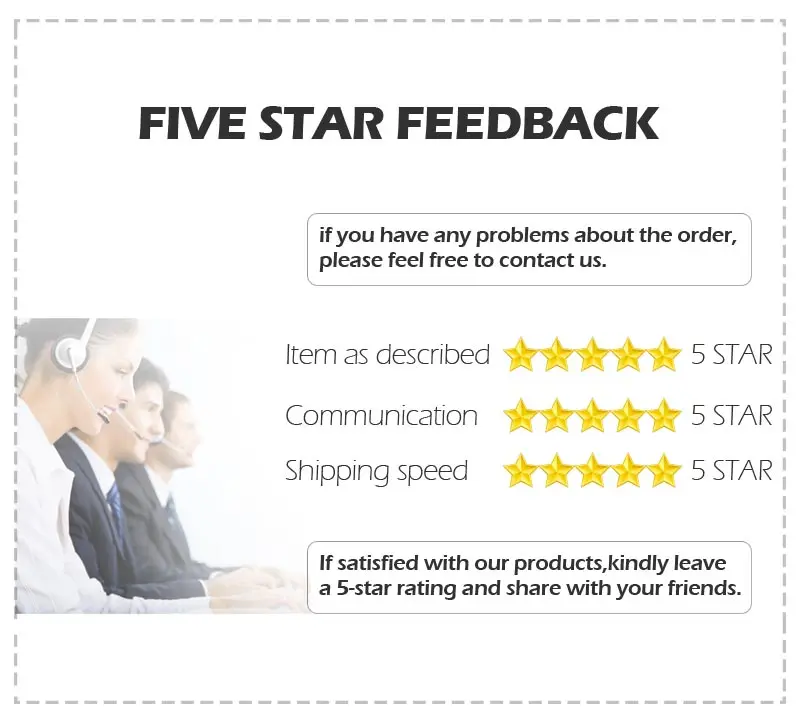 1. Если вы удовлетворены нашими продуктами и услугами, пожалуйста, оставьте положительный отзывы и 5 звезд.2. Если вы не довольны нашими товарами, пожалуйста, свяжитесь с нами, прежде чем оставить негативный отзыв.Мы гарантируем, что мы 100% решим любую проблему для вас и сделаем вас удовлетворенными.