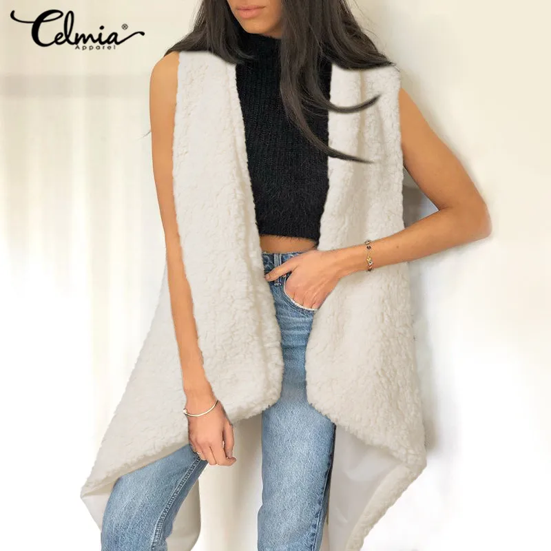 Зимние теплые безрукавки Celmia 2021, женские плюшевые однотонные пальто из искусственного меха, Повседневная Асимметричная верхняя одежда, женские пушистые куртки