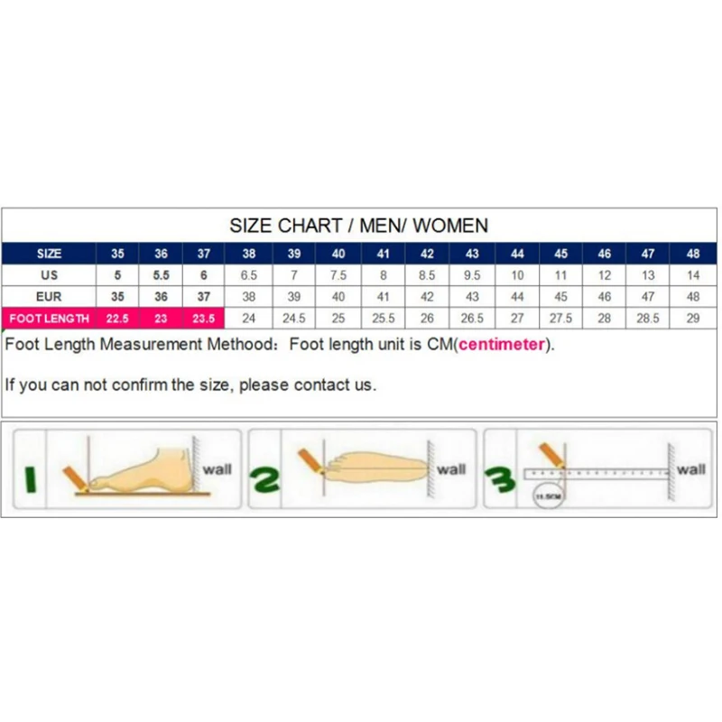 Пожалуйста, внимательно прочитайте нашу таблицу размеров! Это поможет Вам выбрать правильный размер на основеДлина вашей стопы. Обратите внимание, что если ваша стопа слишком длинная или слишком широкая, пожалуйста, выберите размер, который на один размер больше обычного.