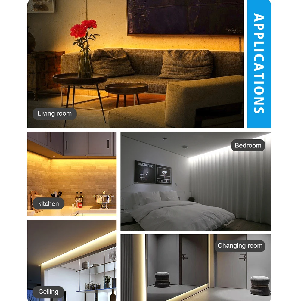 2. Двусторонняя клейкая лента для Светодиодный полоски, с своей превосходной клей и устойчивость к атмосферным воздействиям, может быть прикреплен к любому прозрачное стекло, металл и пластик поверхности, но некоторые поверхности, как, например, ткань и дерево, может повлиять на их функции и долговечность. Перед установкой проверьте адгезию на светильник.