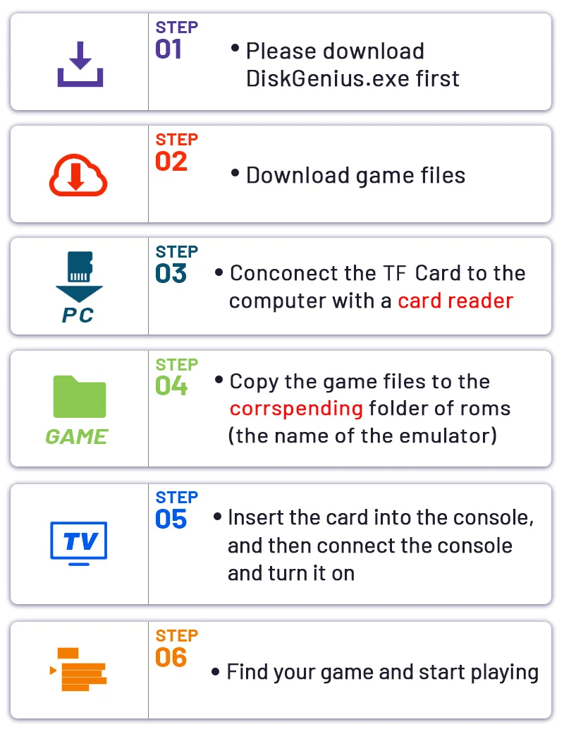 1. Сначала загрузите DiskGenius.exe.2. Загрузите игровые файлы.3. Подключите tf-карту к компьютеру с помощью картридера.4. Скопируйте игровые файлы в соответствующую папку ROM (имя эмулятора).5. Вставьте карту в консоль, а затем подключите консоль и включите ее.6. Найдите свою игру и начните играть.