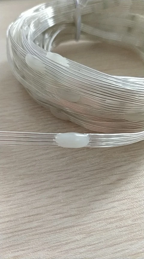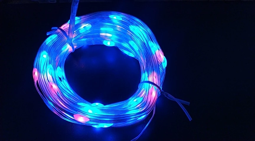 Очень хорошая гирлянда. Это 4 провода. Провода имеют медный сердечник, но покрыты белым полупрозрачным пластиком вместо лака. Все светодиоды, кажется, работают и работают как стандартные ws2812b адресуемые светодиоды.