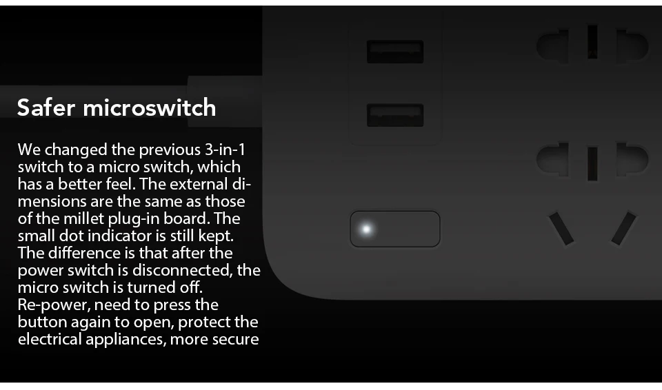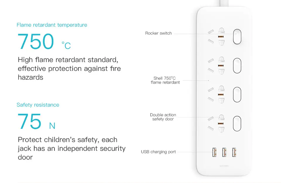 XiaoMi Power Strip met strak wit ontwerp, zo slank als etui6 stopcontacten en 3 usb-poorten met 2A quick opladen functieFosforbrons terminal, koper bar connectiviteit systeemOnafhankelijke veiligheid deuren te houden kinderen weg van het risico van elektrische schokСтатус Subtiele en elegante witte lampje toont werkenВысокая мощность в процентном отношении tot 82 procent20uA lekkage bescherming drempelHoge vlamvertragende standaard tot 750 по Цельсию100 - 220V volledige гаечный ключ sbereikТест штепсельной вилки Passeren (5000 Киров)Противоскользящие подушечки op vier voetenШлифовальный Топ oppervlak en spiegel polijsten behandeling op side oppervlakMooi uiterlijk en eenvoudige voor thuisgebruik en decoratie