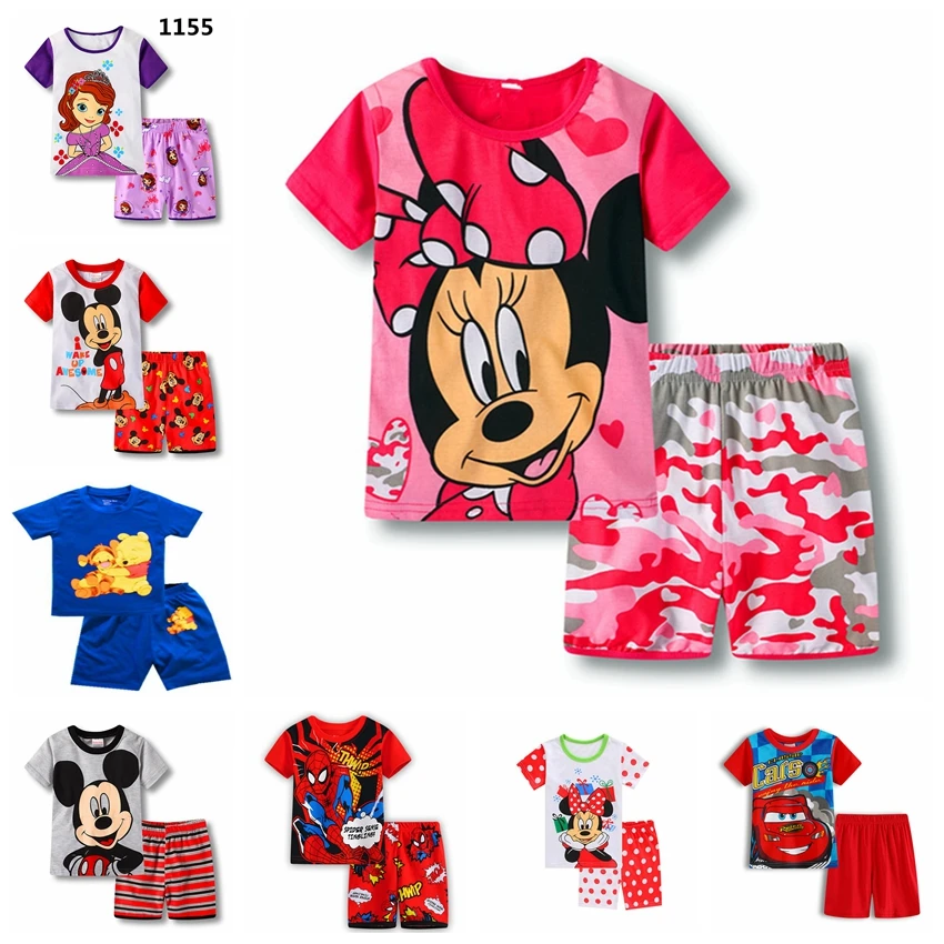 Горячая продажа Новый Детские пижамы летние комплекты с короткими рукавами для маленьких мальчиков Комплекты с героями мультфильмов «Капитан Америка», «машинки», «молния», «Холодное сердце», «Анна», «Эльза», «История игрушек», «Вуди Басс», «Микки Маус», «Минни Маус», «Человек-паук», детская одежда для сна с принтом «Пух»; Пижамные комплекты с номером отслеживания