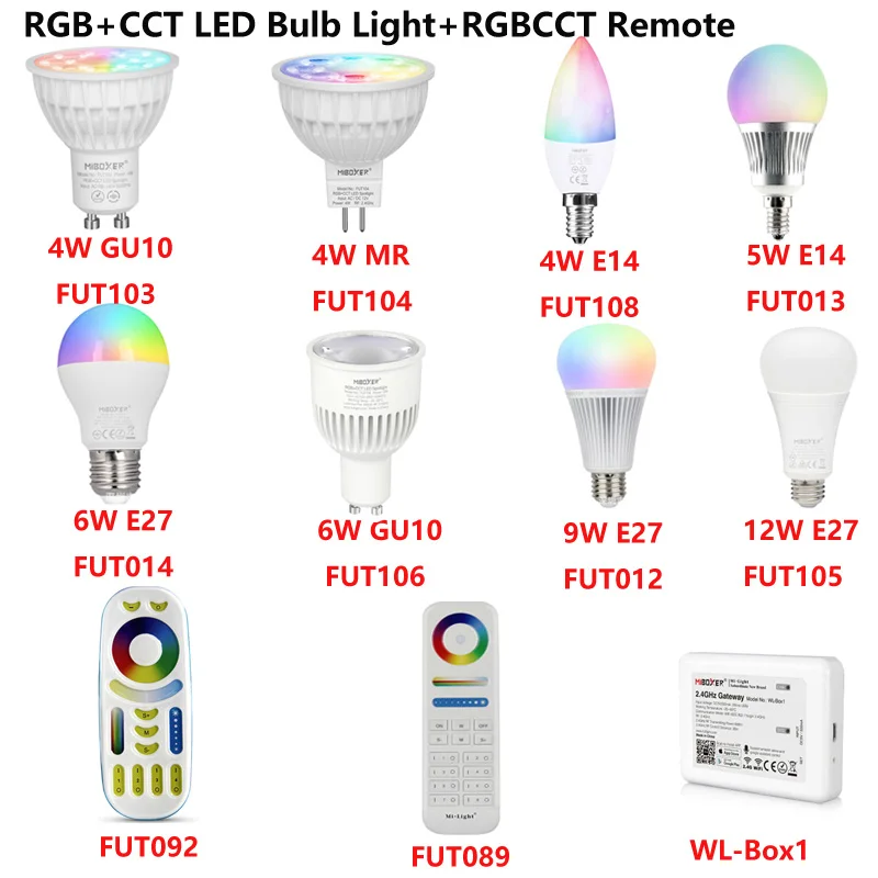 Умная светодиодная лампочка Miboxer, RGB + CCT, E14, E27, MR16, GU10, 4 Вт, 5 Вт, 6 Вт, 9 Вт, 12 Вт, Wi-Fi, Беспроводное дистанционное управление через приложение, голосовое управление
