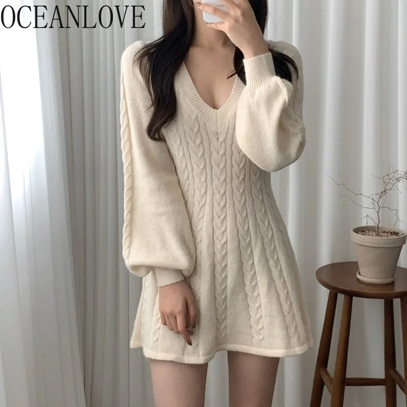 OCEANLOVE Женская одежда с рукавами-фонариками с V-образным вырезом Вязаные корейские шикарные винтажные женские платья осенне-зимние платья милые