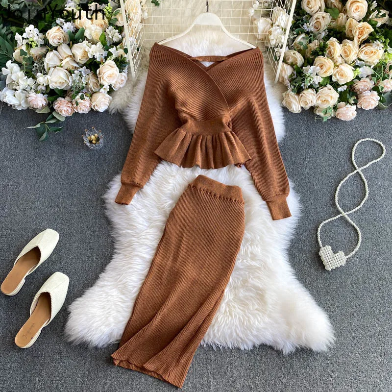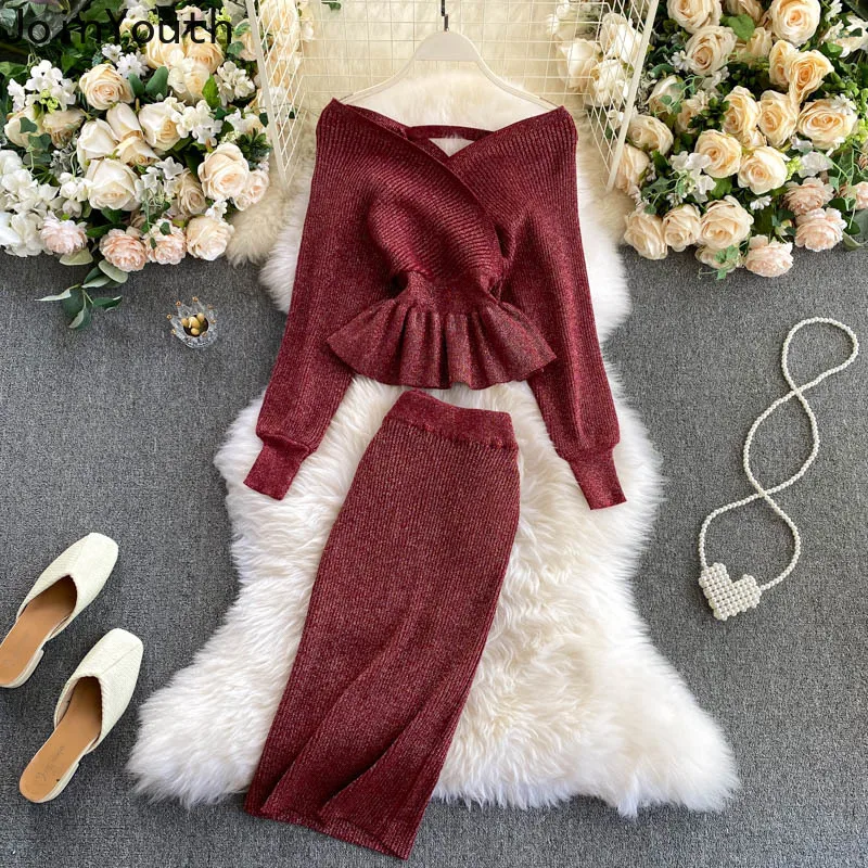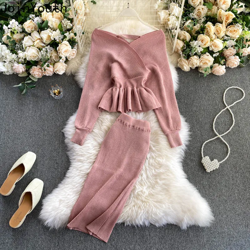 Комплект из двух предметов Joinyouth в Корейском стиле, женские пуловеры с длинным рукавом и воротником-лодочкой + Однотонная юбка-карандаш, Женский вязаный костюм, 2 шт.