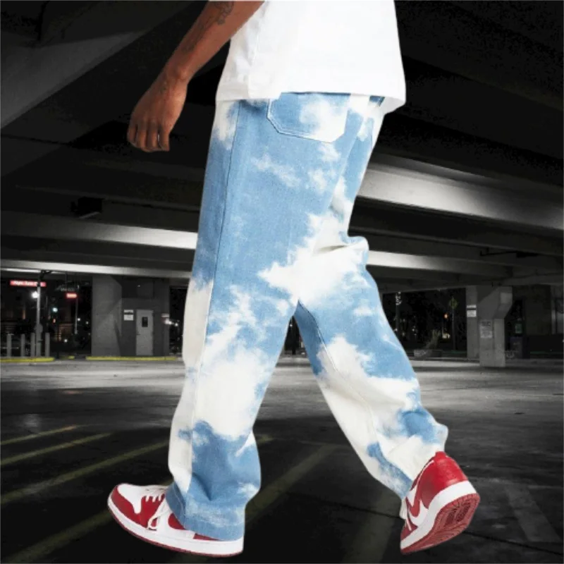 Прямые брюки мужские свободного покроя, повседневные Прямые джинсовые штаны с принтом, небесно-голубые, прямые, 2021