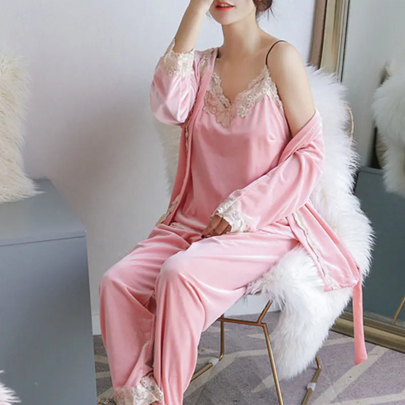 Женская пижама, зима 2022, золотистый бархатный комплект из 3 предметов, Осень-зима, 5 цветов, кружевная пикантная Ночная рубашка на бретельках с длинными рукавами