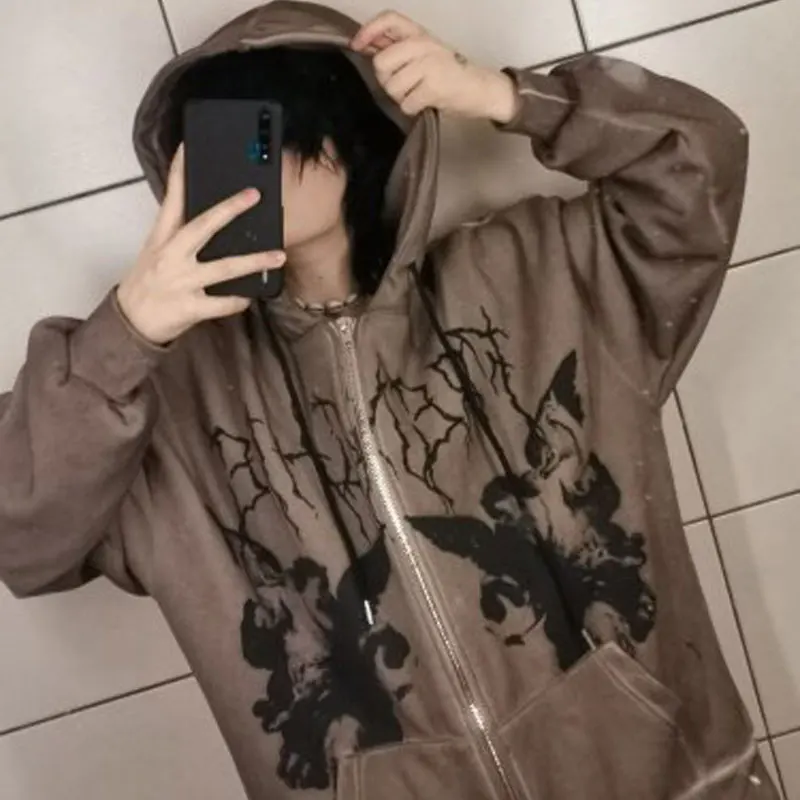Куртка с капюшоном и принтом ангелов, на молнии, с длинным рукавом