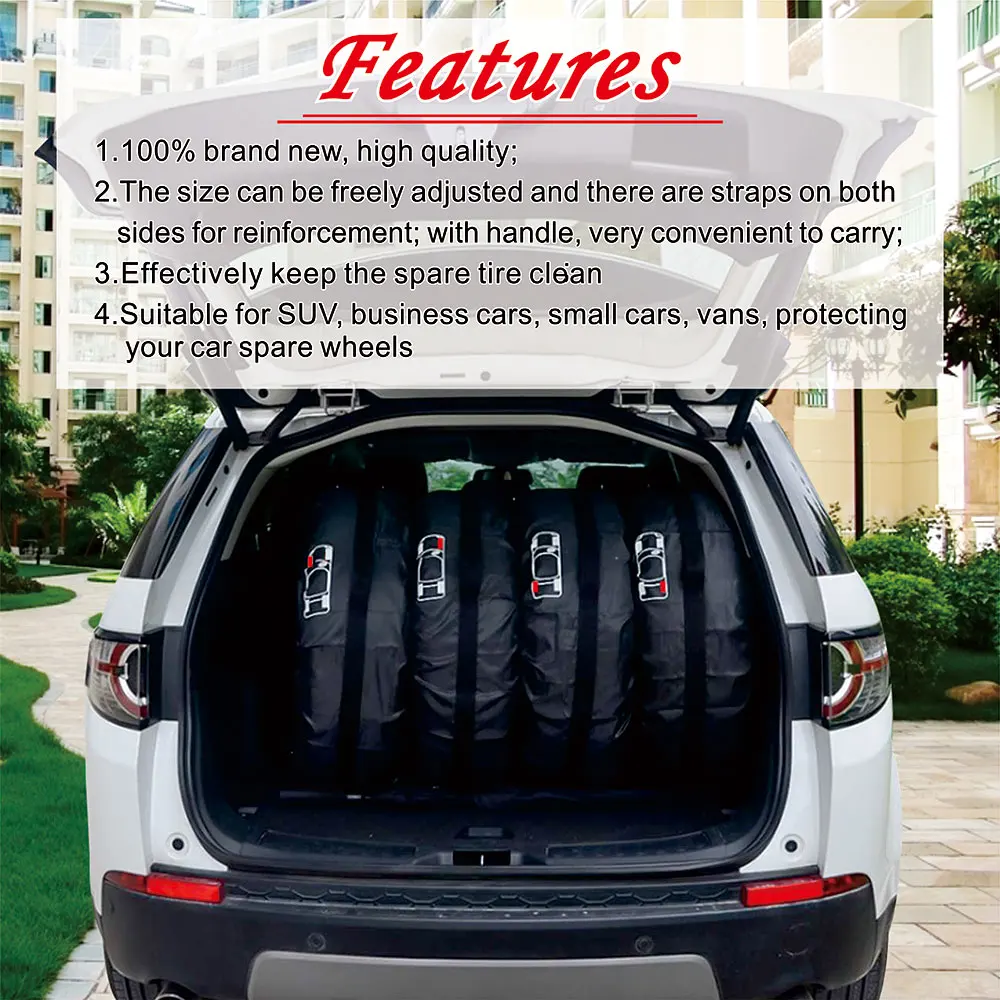-Материал: S-190T полиэфирная тафта, L-210T из полиэфирной тафты-Цвет: красный/черный-Размер: S/L-Применение: подходит для хранения автомобильных запасных шин -Применимый Размер шин:S (диаметр 66 см/26 дюймов) подходит для шин 13-16 дюймовL (диаметр 80 см/31 дюйм) подходит для шин 16-20 дюймов(Пожалуйста, подтвердите размер шины перед покупкой.) -Количество: 1 шт./4 шт.-Размещение на транспортном средстве: спереди, сзади, слева, справа