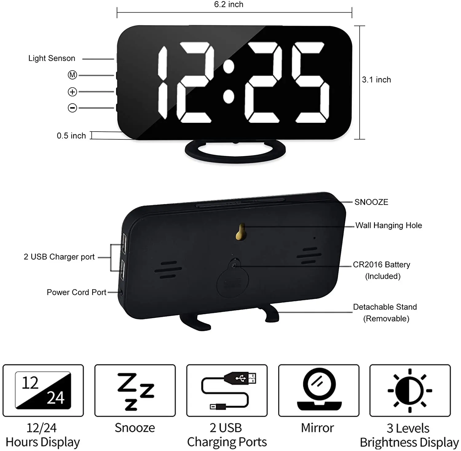 1. Функция: светодиодный дисплей, повтор, будильник, Двойной выход USB, память времени, Автоматическое затемнение
