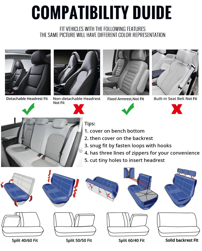 * Чехол для сиденья подходит для моделей автомобилей-чехол для сиденья подходит для съемных подголовников (двойной чехол для переднего сиденья + чехол для заднего сиденья)
