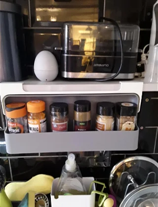 заказывала под новую кухню на дачу. Буду заказывать ещё одну, много приправ. Покупайте, вам понравится. Если навесная кухонная полка закрывается полностью дверкой, то при установке контейнера для специй дверь плотно не закроется. Выглядит как на фото.
