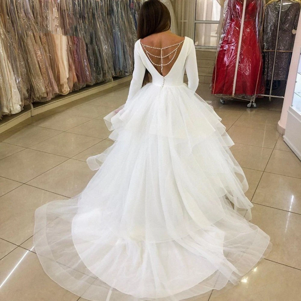 2021 Многоярусное ТРАПЕЦИЕВИДНОЕ белое свадебное платье из органзы, юбка с длинным рукавом и глубоким V-образным вырезом, свадебное платье с жемчугом на спине