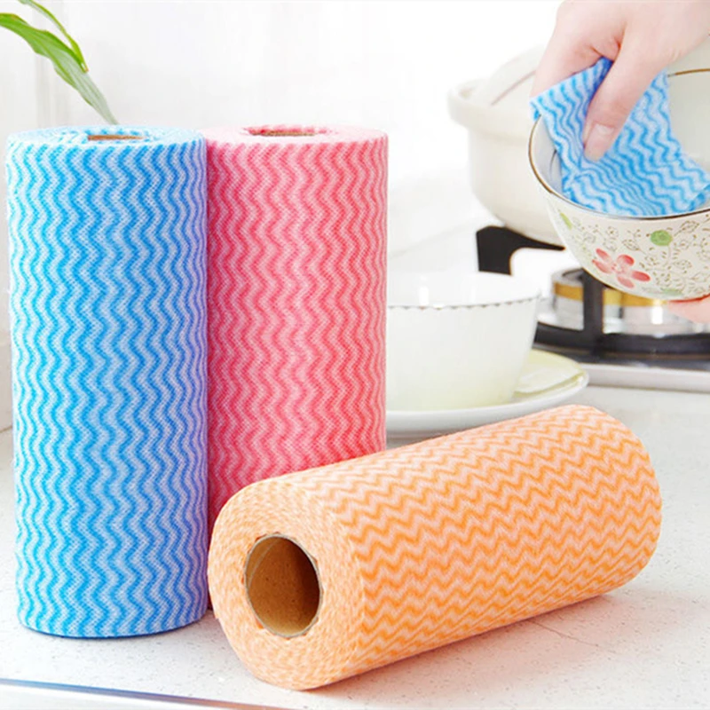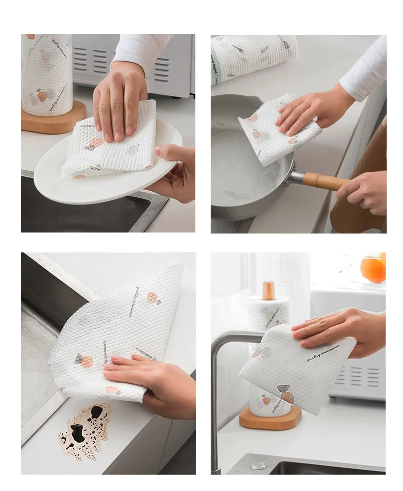 Особенности:-- Нетканый материал, хорошо впитывает воду, не крошки.-- 50 шт/рулон, одноразовый дизайн, прост в использовании.-- Не повреждает покрытие посуды, не оставляет следов пятен.-- Широкий спектр применения, лучшие чистящие инструменты для кухни, ванной комнаты, чаши, посуды, кастрюли и так далее.