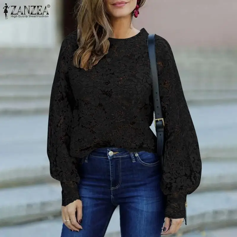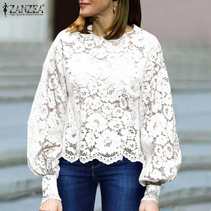 ZANZEA элегантная Осенняя рубашка с длинными рукавами-фонариками стильная открытая OL Blusas Повседневная однотонная Туника Топы 2022 Женская кружевная блузка кроше