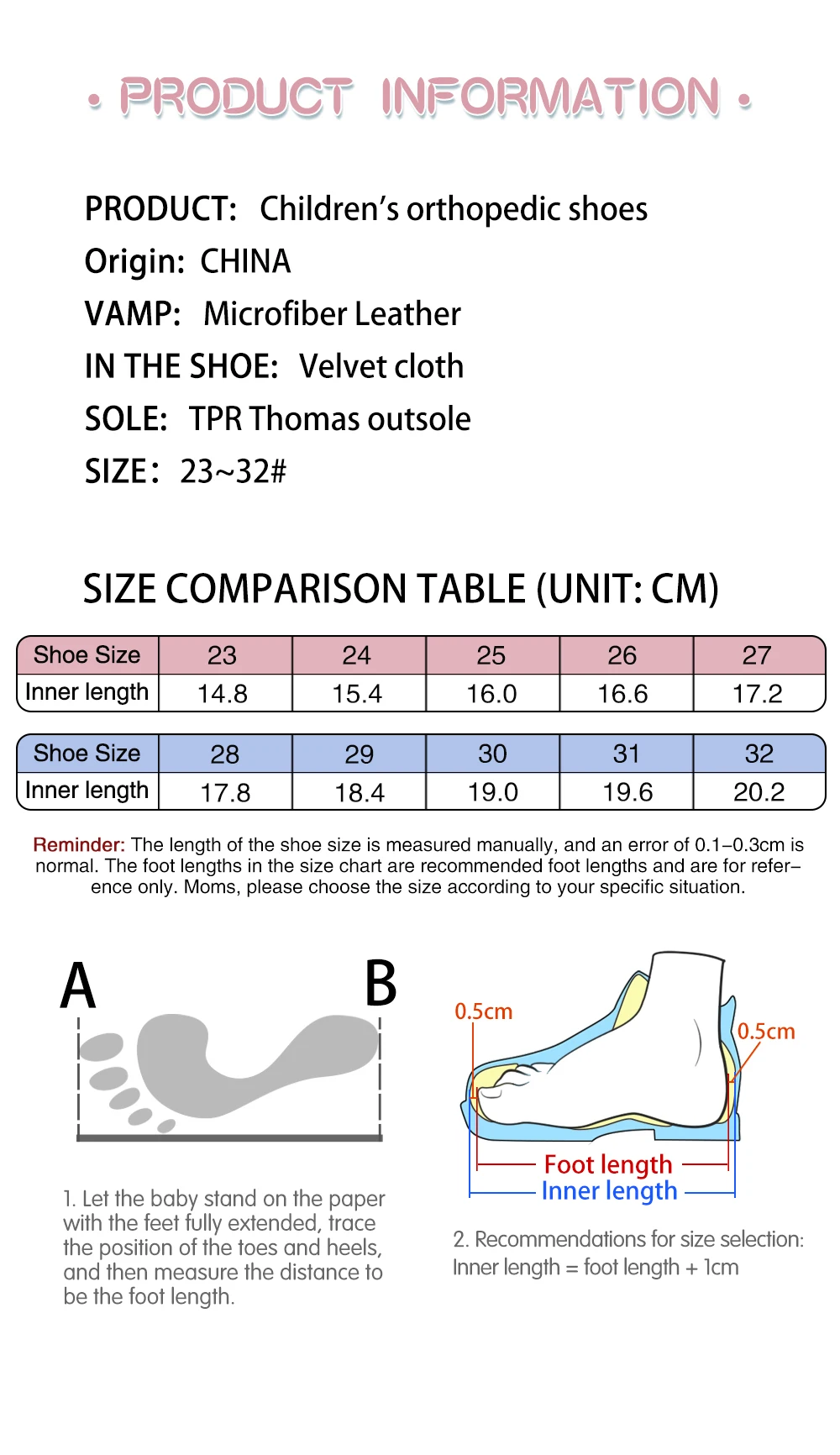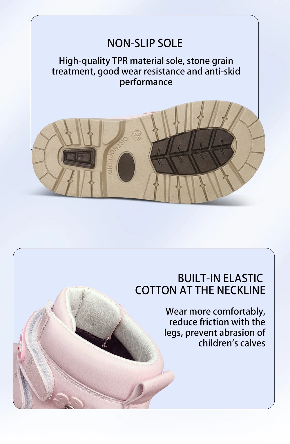 Исправьте деформацию ног, чтобы помочь здоровому росту суставов детских ног. > 2. Каковы особенности ортопедической обуви?1) прочные и прочные удлиненные задние колпачки стабилизируют стопу в правильном положении.2) мягкие внутренние воротники обеспечивают гладкий контакт кожи с краями обуви во время движения.3) Арка поддержки стельки и Томас пятки подошвы, чтобы дать поддержку стопы.4) застежка на липучке плотно фиксирует ноги внутри обуви > 3. Каковы функции ортопедической обуви?Для профилактики и лечения ортопедических аномалий. Для предотвращения и исправления детской плоскостопия, лапки, стопа с вальгусной деформацией, супинатором, пронатором, клубной стопой, ногой X/O и т. д. > 4.подходит ли для ортопедической обуви нормальная стопа?Да, нормальные здоровые ноги также подходят для ношения ортопедической обуви. Ортопедическая обувь очень важна для первых шаговРебенок фиксирует стопу, увеличивает область поддержки стопы и перераспределяет нагрузку на тело, избегая деформации стопы, чтобы помочьНормальный здоровый рост ног.Поэтому родитель должен начать выбирать ортопедическую обувь для ваших детей, когда ребенок учится ходить.