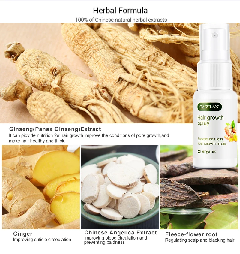 100% китайских натуральных растительных экстрактов★Женьшень (Panax женьшень) экстрактЭто может привести к пиовидному питанию для роста волос, подтвердить состояние роста пор и сделать волосы здоровыми и густыми.★ИмбирьУлучшение циркуляции кутикулы★Экстракт китайской АнжеликиУлучшение кровообращения и предотвращение облысения★Флис-корень цветкаРегулирование кожи головы и взбивание волос