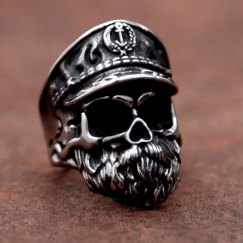 Название: винтажное черное кольцо из нержавеющей стали с бородатым капитаном черепом для мужчин, массивное металлическое панк готическое кольцо, мужское байкерское ювелирное изделие, оптовая продажа