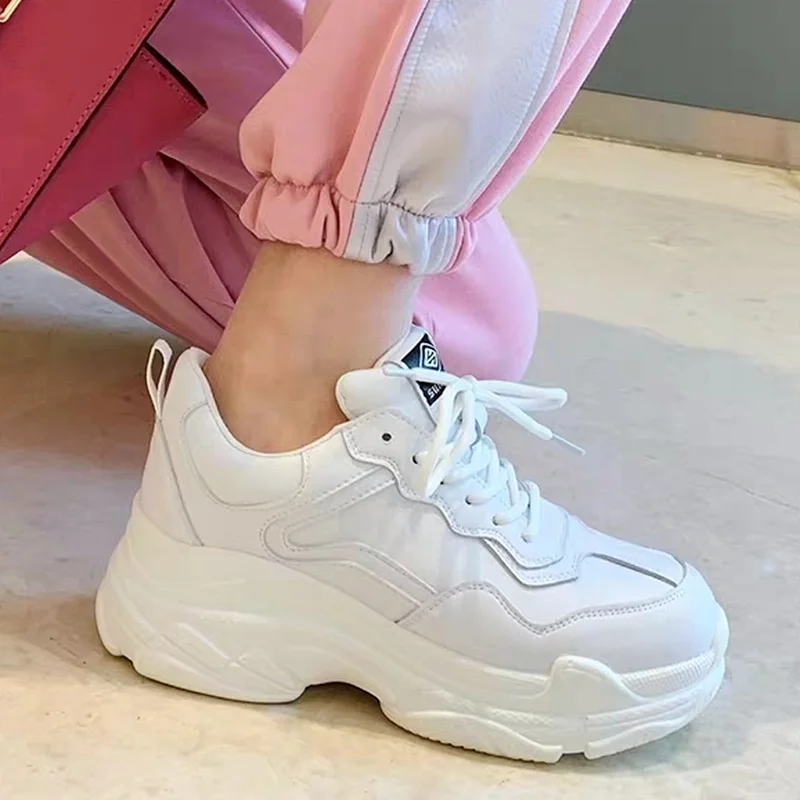 Женские кроссовки на платформе и толстом каблуке, Белые Повседневные туфли из искусственной кожи на шнуровке с круглым носком, на среднем каблуке, новинка 2022