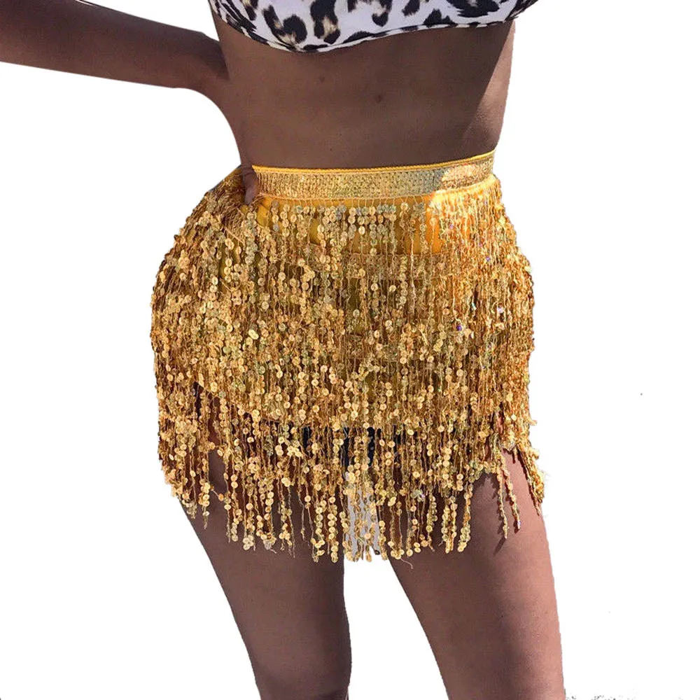 Мини-Юбка с запахом для женщин и девушек, Летняя Сексуальная Женская Юбка для танца живота, юбки с блестками и бахромой, сарафан с блестками L4