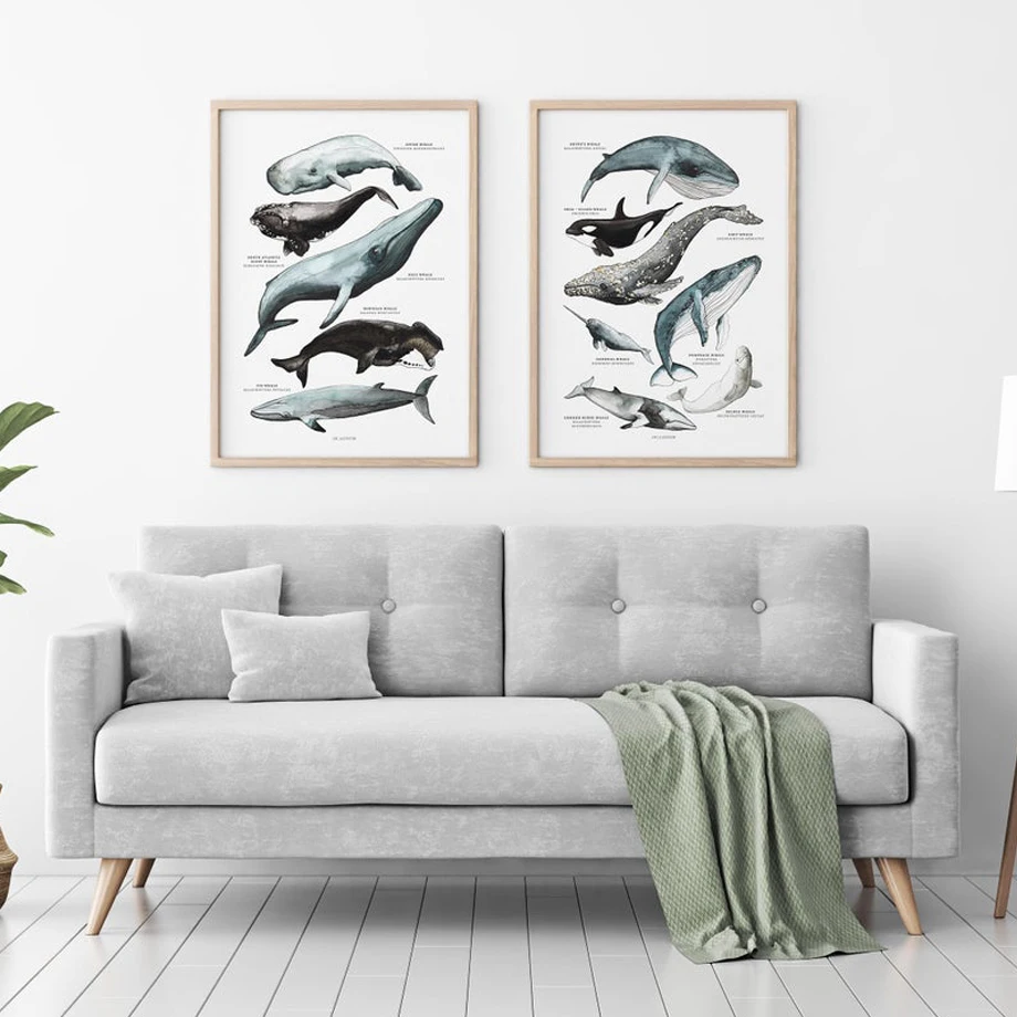 Настенная картина с акварелью, морской жизнью, Китом, акулой, бумага для рисования на холсте, скандинавские плакаты и принты, настенные картины для декора гостиной