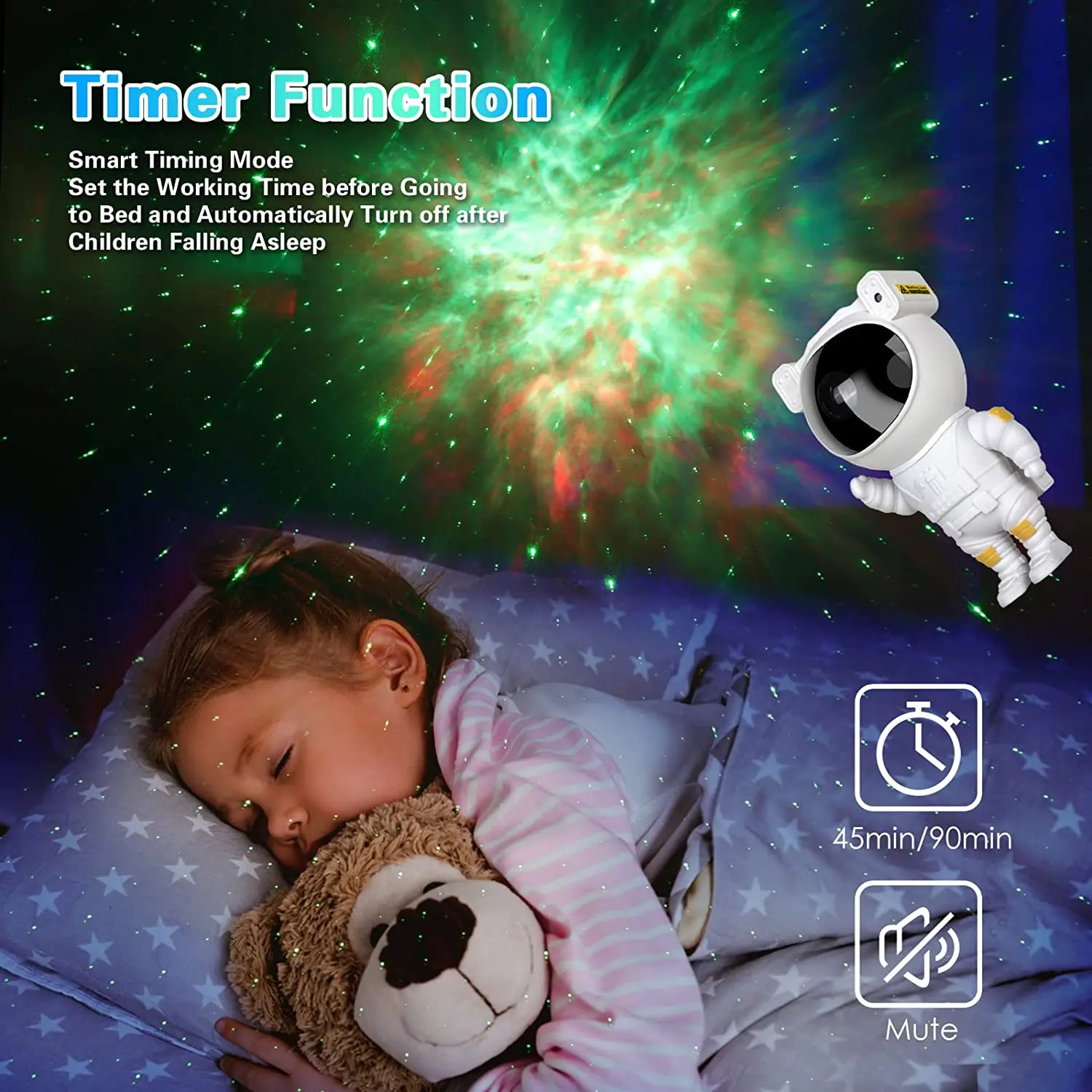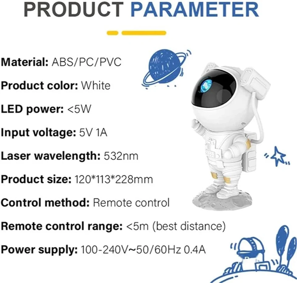 Head головка космонавта может вращаться на 360 °, угол проекции можно регулировать по желанию, что является простым в использованииCombination сочетание туманности и звездного света можно воспроизводить отдельно или в комбинации⋆Smooth лунный базовый дизайн⋆Можно использовать как прожекторную лампу, но и как высококлассное украшение