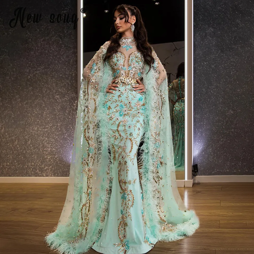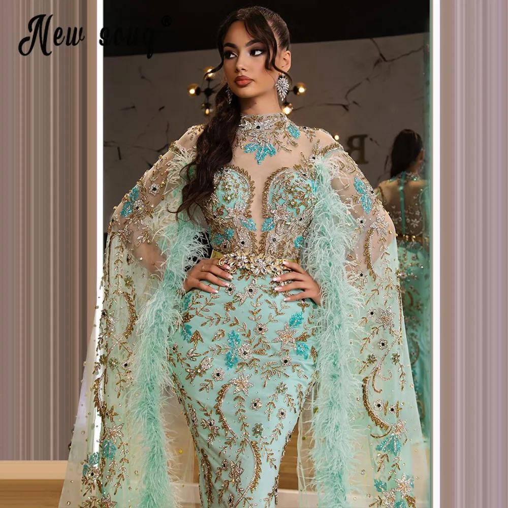 Роскошное вечернее платье с перьями и кристаллами, с рукавом-накидкой, арабское выпускное платье для женщин, свадебное платье, кружевное платье Vestido De Novia