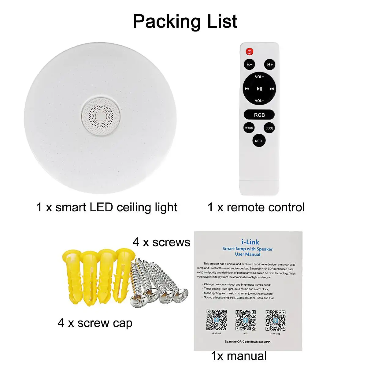 Посылка включает в себя:1 Умный светодиодный потолочный светильник4 винта4 x винтовая крышка1 пульт дистанционного управления1 х РуководствоСпецификация:-Напряжение: 220 В/100 В-265 в/85 В-265 в-Диаметр: 400 мм-Название продукта: музыкальная лампочка bT crystal-Размер абажура: 33 см/12,9''-Материал корпуса лампы: акрил-Светильник: белый + RGB-Доступные цвета: Да-Возможность затемнения: Да-Мощность: 300 Вт-Место использования: подходит для семейных встреч, КТВ-боксов, дискотек, танцевальных залов, ночных клубов, баров, торговых центров, ресторанов, караоке, квадратов, парков и других местХарактеристика:-Использование высокого качества светодиодный чипы, из плотного акриловая доска, длительный срок службы и прочный.-Интеллектуальное управление: вы можете управлять светом с помощью различных методов, таких как мобильное приложение и пульт дистанционного управления, предоставляя вам более удобные методы управления.Примечание:1. Допускается погрешность в 1-3 см из-за ручного измерения. Перед размещением заказа, пожалуйста, внимательно ознакомитесь со всеми условиями.2. Цвета могут отличаться, так как на дисплее разница, пожалуйста, поймите.