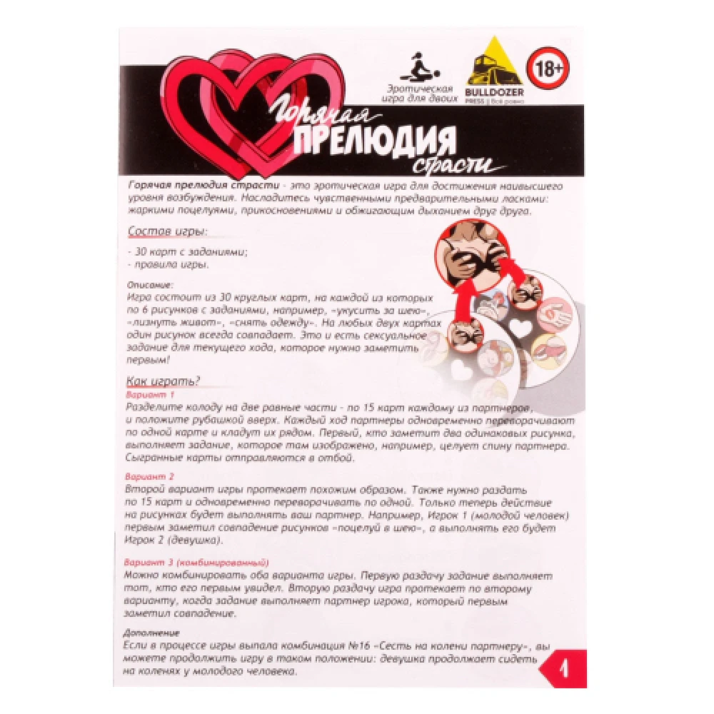 1. ОПИСАНИЕ Горячая ПРЕЛЮДИЯ Страсти - это эротическая игра для достижени наивысшего уровня возбуждения. Насладитесь чувственными предварительными ласками: жаркими поцелуями, прикосновениями и обжигающим дыханием друг друга.Игра состоит из 30 круглых карт, на каждой из которых размещено по 6 рисунков с заданиями, например, "укусить за шею", "лизнуть живот", "снять одежду". На любых двух картах один рисунок всегда совпадает. Это и есть сексуальное задание для текущего хода, которое нужно заметить первым!