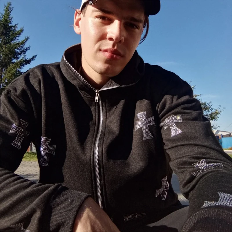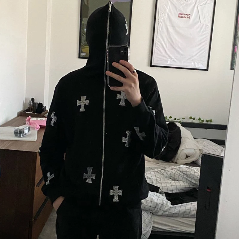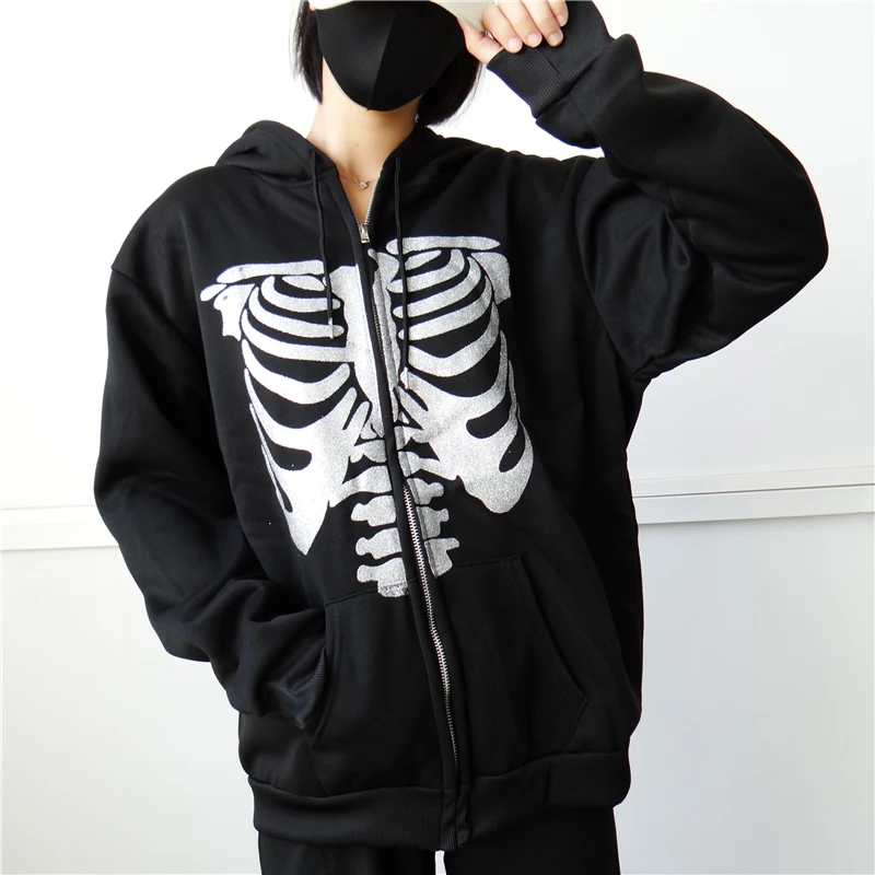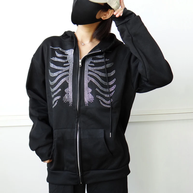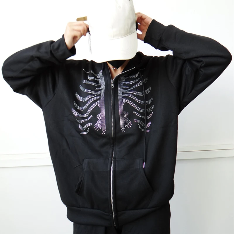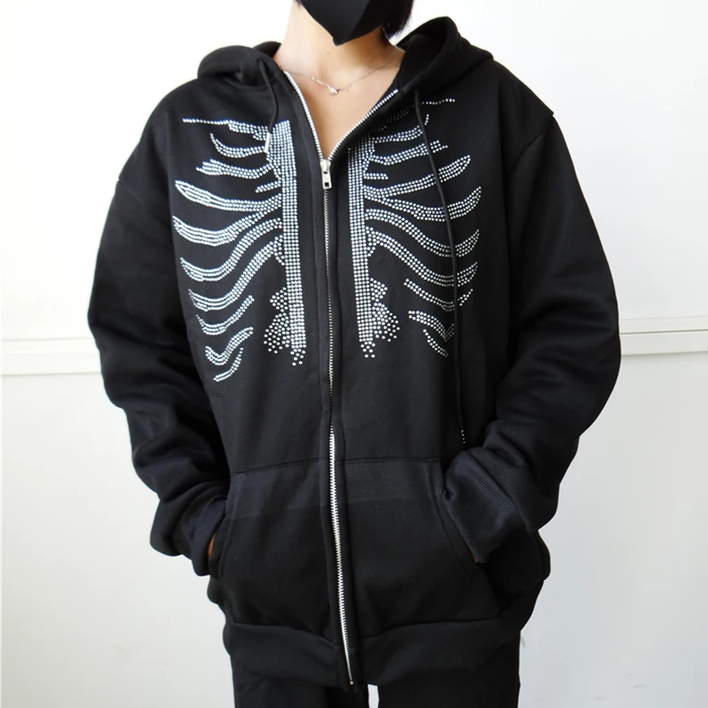Y2k Стразы Толстовка со скелетом на молнии готическая Черная Повседневная Толстовка Оверсайз мужская куртка в стиле панк Харадзюку гранж с капюшоном уличная одежда