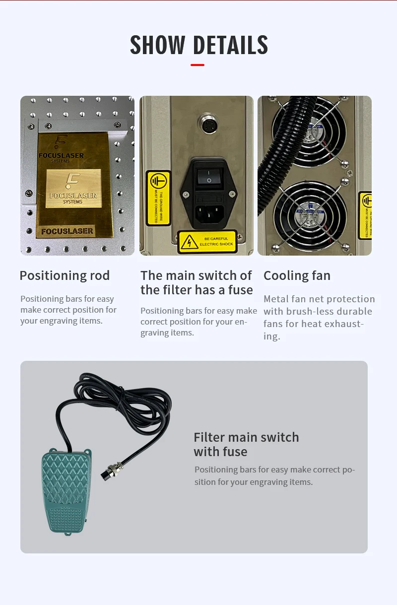 Переключатели и кнопки: импортированные из Тайваня известные бренды с самым длинным временем включения и выключения. По сравнению с другими конкурентами никто не использует такие дорогие переключатели и кнопки. Аварийная остановка: нажмите вниз, чтобы отрезать все электрические машины для безопасности оператора и продуктов. Клавишный переключатель: Управление основной мощностью машины. Мы можем использовать ключ или без вставки типа ключа, чтобы избежать потери ключа. Красный светильник Кнопка индикатора: включить и выключить красный светильник при необходимости. Например, когда вы делаете позиционирование красный светильник яркий может выключить, может сохранить красный светильник срок службы лазера.