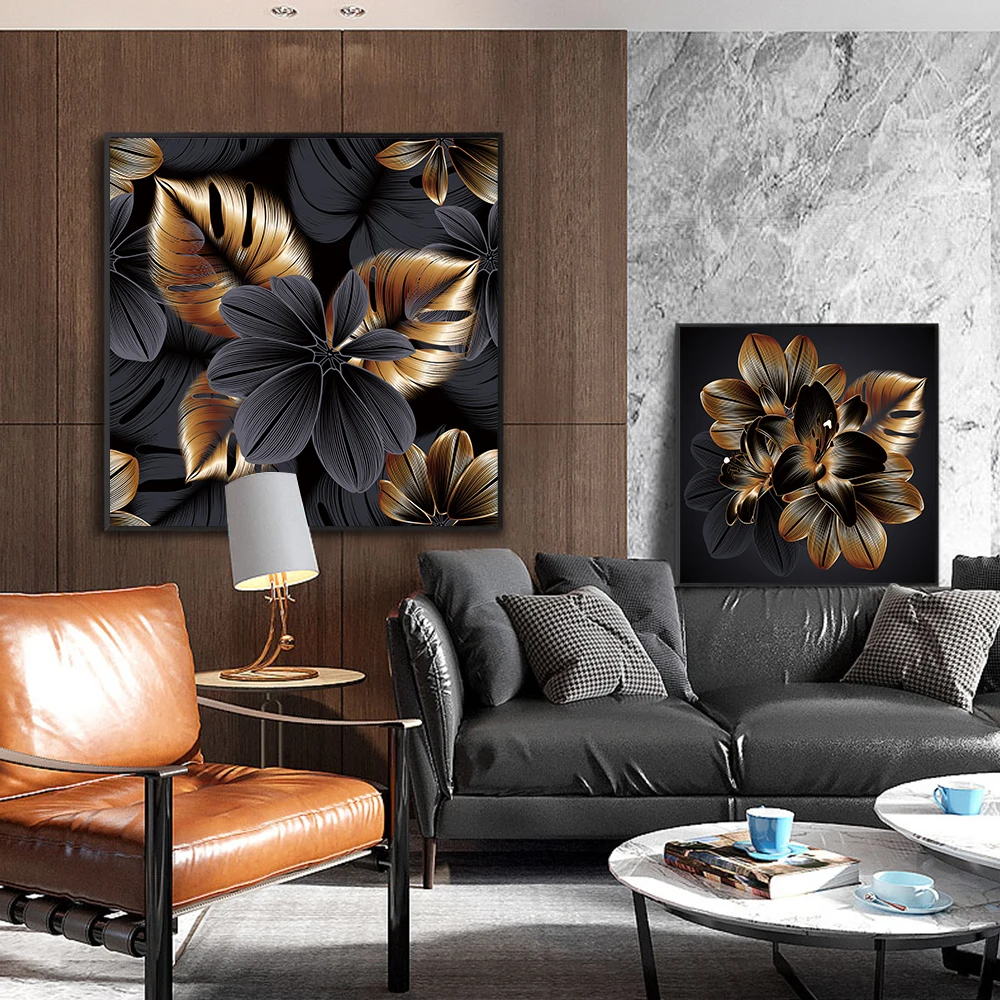 Черные золотые цветы, холст для интерьера, картины в скандинавском стиле, настенное искусство, современные минималистичные плакаты, картины, украшение для гостиной