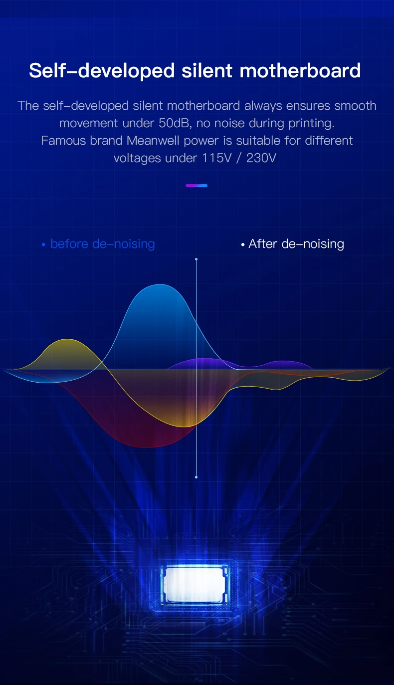 Самостоятельно разработанная Бесшумная материнская плата всегда обеспечивает плавное движение под 50 дБ, отсутствие шума во время печати.