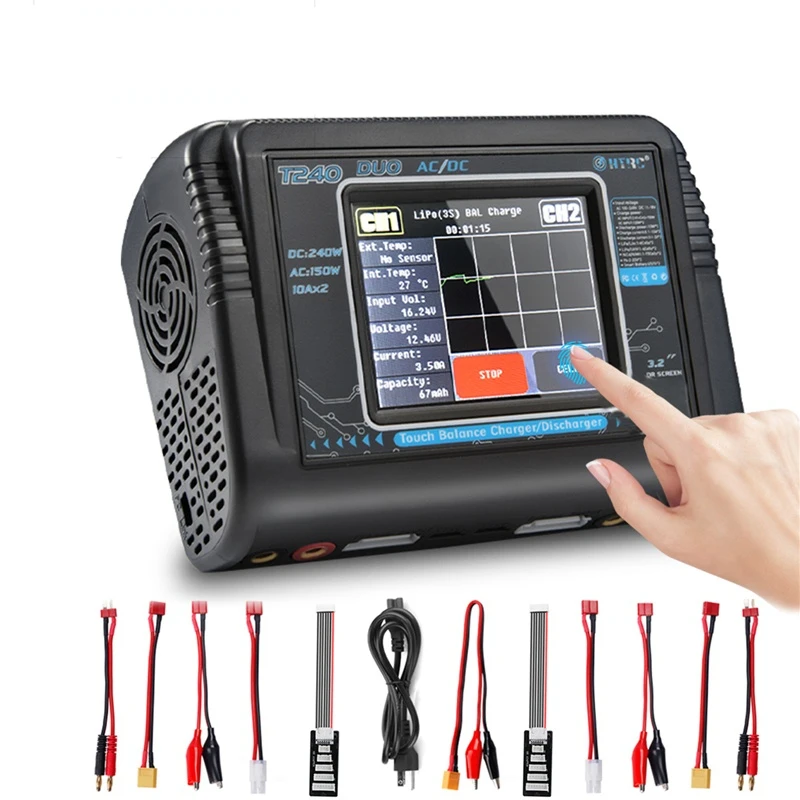 Балансирующее зарядное устройство HTRC T240C240 150 Вт240 Вт, для батарей LiPo, AC, DC, 10 А, с сенсорным дисплеем, два канала, с функцией зарядаразряда, для радиоуправляемых моделей