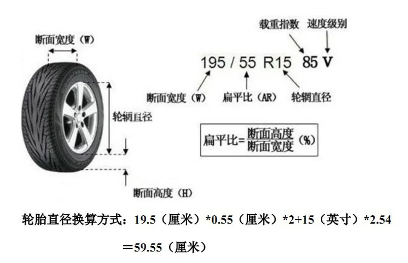 E.g: Технические характеристики шин 195/55R15Метод преобразования диаметра: диаметр (см) = W * AR/500 + R * 2,54 формула: диаметр = W * AR/500 + 2,54 * R = 195*55/500 + 2,54*15 = 59,55 в соответствии с расчет, малый размер, подходит.