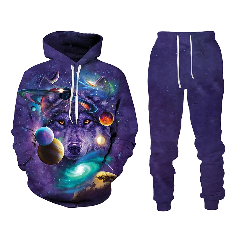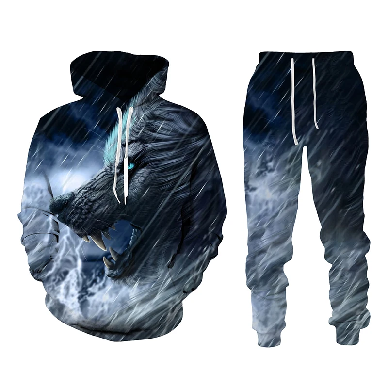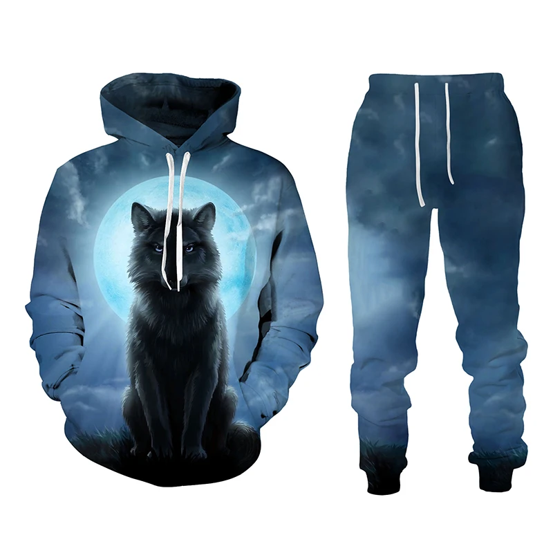 Мужской спортивный костюм с 3D-принтом волка, Черный Повседневный пуловер с капюшоном и штаны, Осень-зима 2019