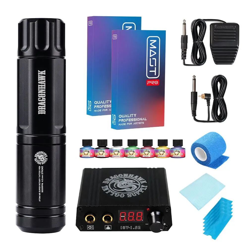 Мощный мощный электродвигатель Dragonhawk, 4-миллиметровая тату-машинка, Миниатюрный блок питания с ЖК-дисплеем, 7 шт. чернильных пигментов Mast Pro, набор игл для картриджей
