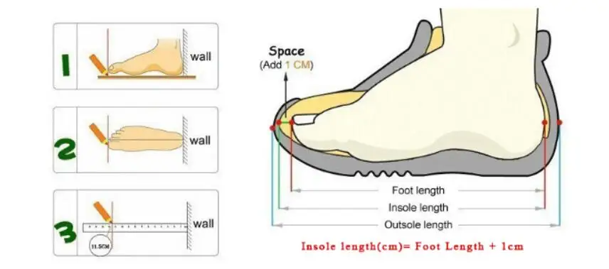 Например: длина стопы вашего ребенка составляет 18 см, а затем вам нужно заказать размер стельки 19 см.