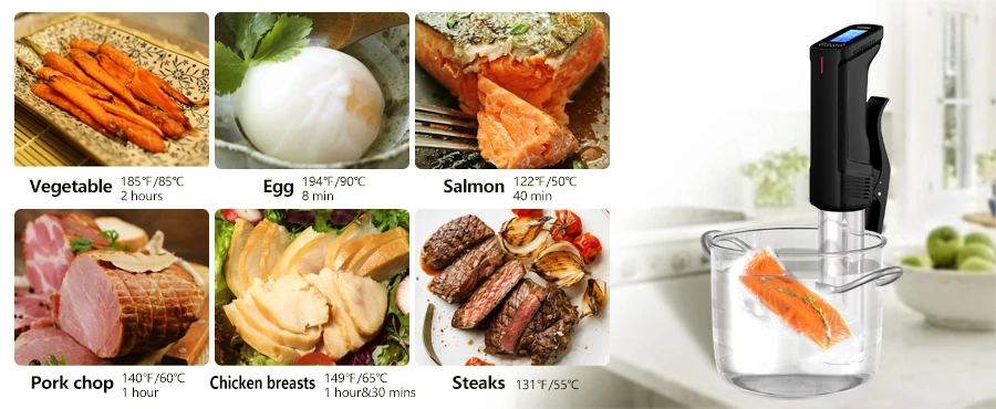 ✅Простота в использовании ---Подключи и работай. Закрепите Sous Vide в горшке с помощью зажима, Налейте горшок водой, запечатайте еду в пакете и положите в кастрюлю, установите питание до точной температуры, тогда вы можете получить идеальный выбор.