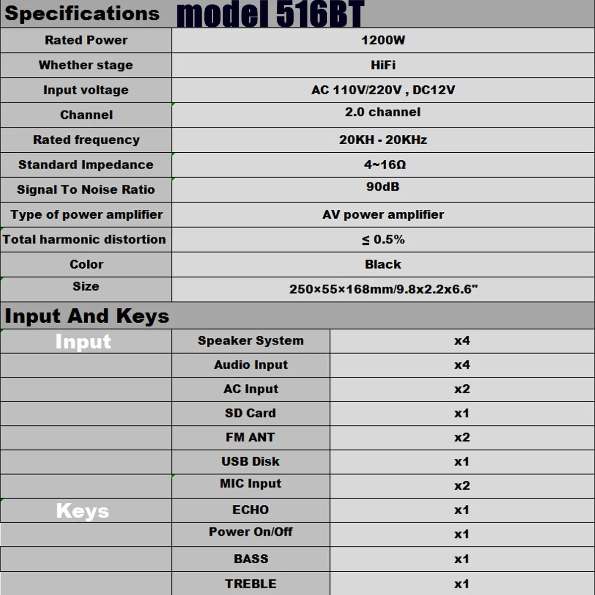 Модель: AV-516BTРазмер: 250 × 55 × 168 мм/9,8x2,2x6,6"Напряжение: AC 110 В/220 В, DC12VНоминальная мощность: 1200 ВтПик: 2000 ВтНоминальная частота: 20KH - 20 кГцОтношение сигнал-шум: 90 дБСтандартное сопротивление: от 4 до 16 ОмТип усилителя мощности: AV усилитель мощностиКанал: 2,0 каналОбщее гармоническое искажение: ≤ 0.5%Чувствительность входного сигнала: 200 мВ (± 30 мВ)Чувствительность на входе микрофона: 9 мВ (± 2 мВ)Выход уровня записи: 1 вВспомогательный уровень выхода: 1 вПоддержка: USB диск/макс. 64 Гб sd-карта (не входит в комплект)Цвет: черныйВ комплект входит:1 х аудио усилитель мощности1 пульт дистанционного управления1 х шнур питания1 x Руководство пользователя