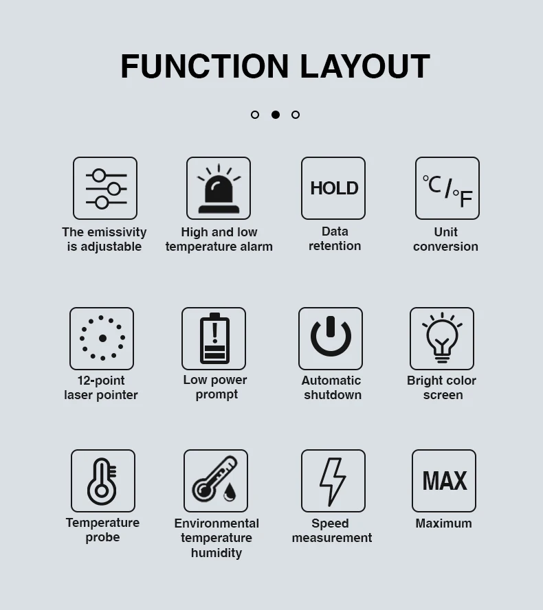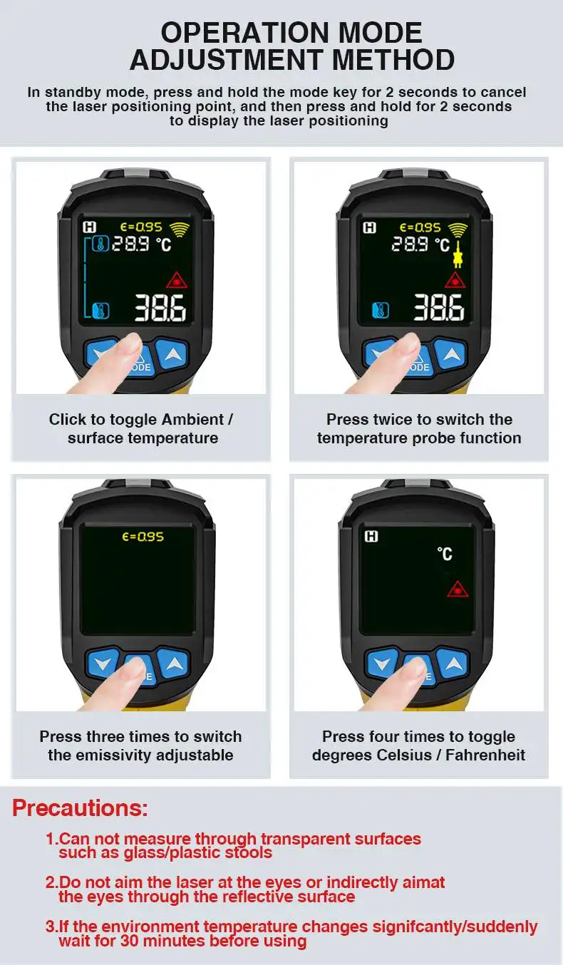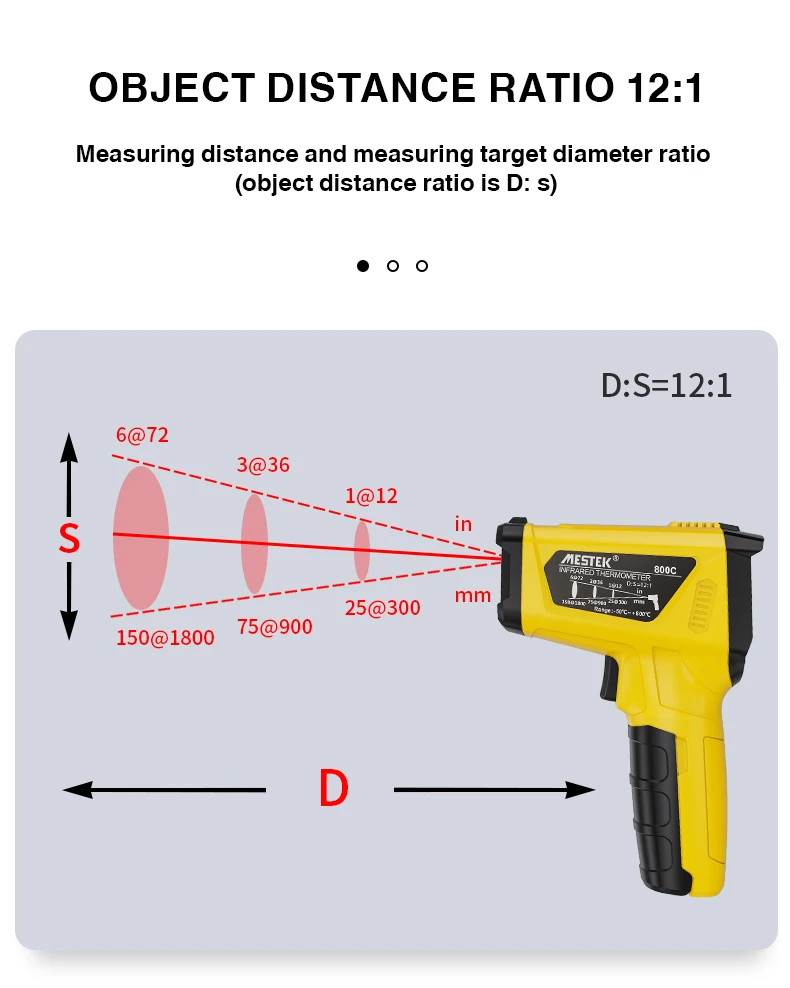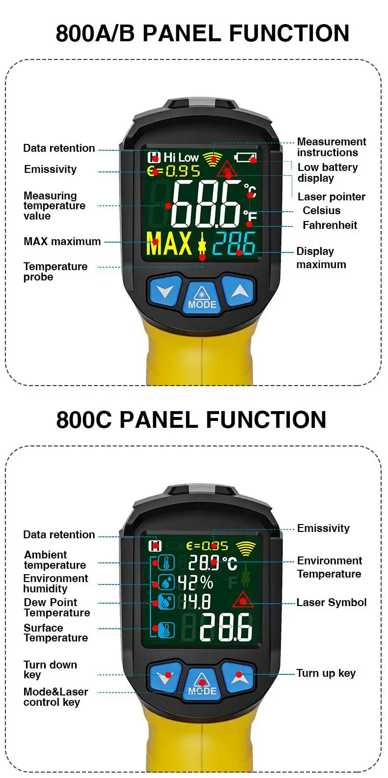 Примечание: батарея в комплект не входитМодель: 800A,800B,800CДиапазон измерения температуры:800A:-50 ~ 800C800B:-50 ~ 800C, с температурным зондом800C:-50 ~ 800C, с температурным зондом, температура окружающей среды:-10 ~ 60C, влажность окружающей среды: 0% ~ 100% RH плесени и температуры точки росыD:S : 12:1Излучение: 0,1 ~ 100 регулируемаяДиапазон отклика: 8 ~ 14 мкмЛазерное позиционирование: 12 точечное кольцо, указывающее температуру чувствительной зоныЛазер:<1 мВт/630-670нм Уровень 2Время отклика:<0.5sАвтоматическое выключение: 30 секунд
