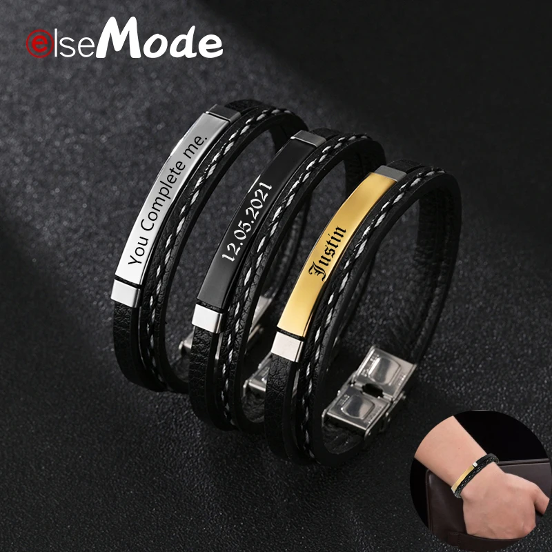 ELSEMODE персонализированный кожаный мужской браслет в стиле панк с именем, 2 слоя, нержавеющая сталь, под заказ, крутые ювелирные изделия для Муж папа, парня