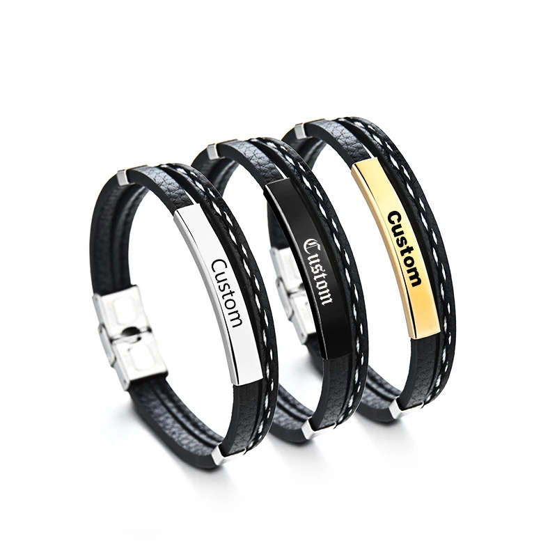 Персонализированные панк кожаный мужской браслет имя 2-Layered нержавеющая сталь пользовательские крутые ювелирные изделия для Муж папа подарок бойфренду на день рождения