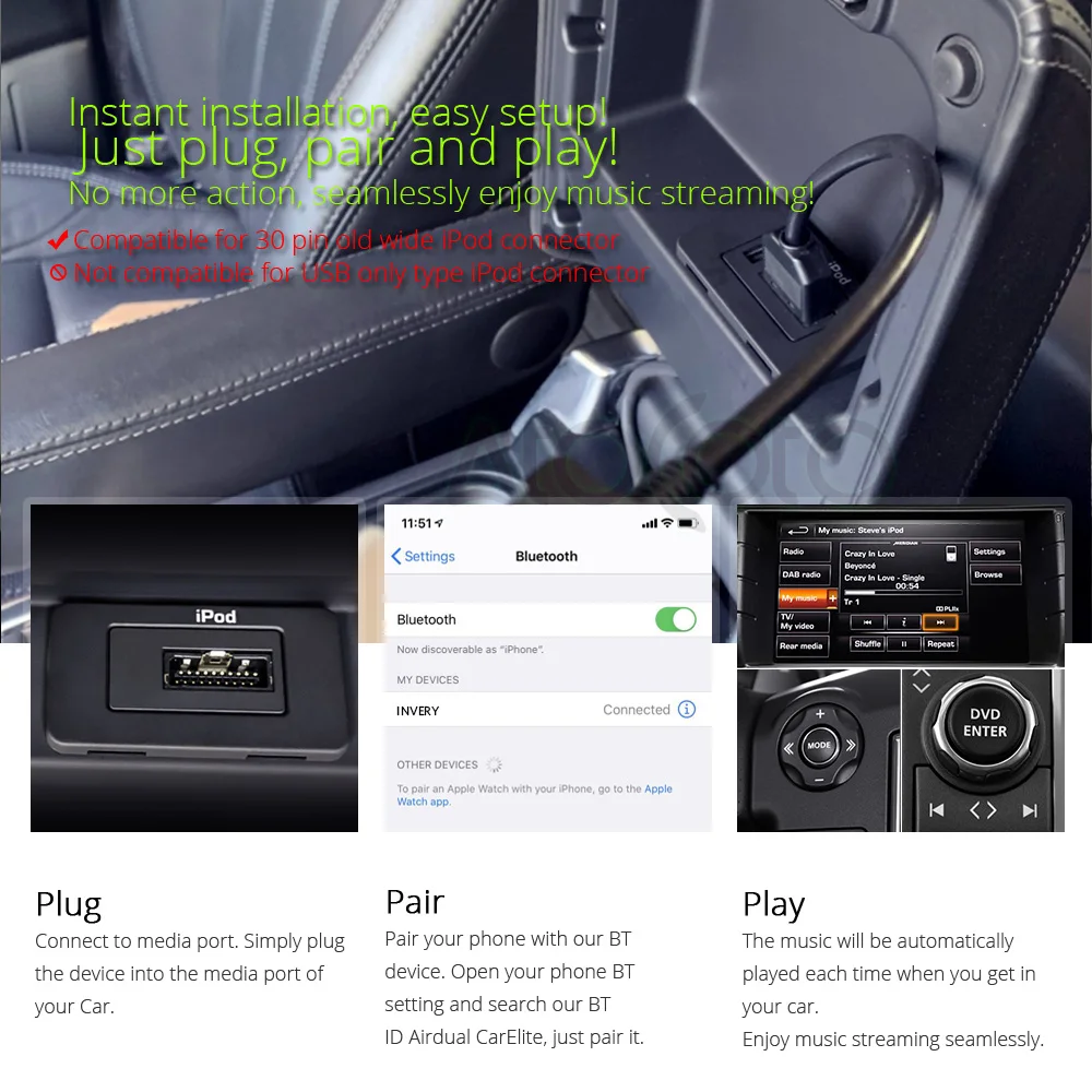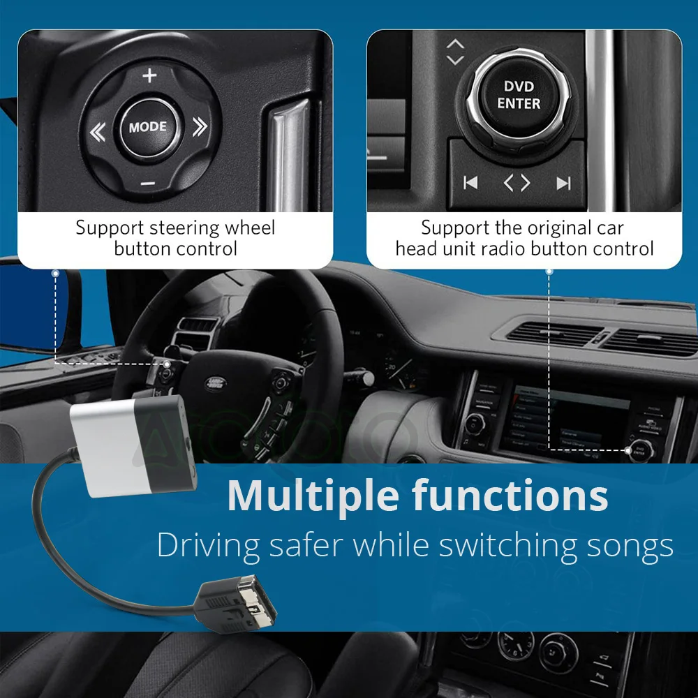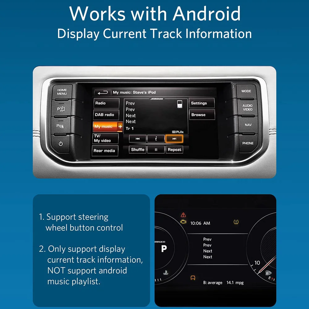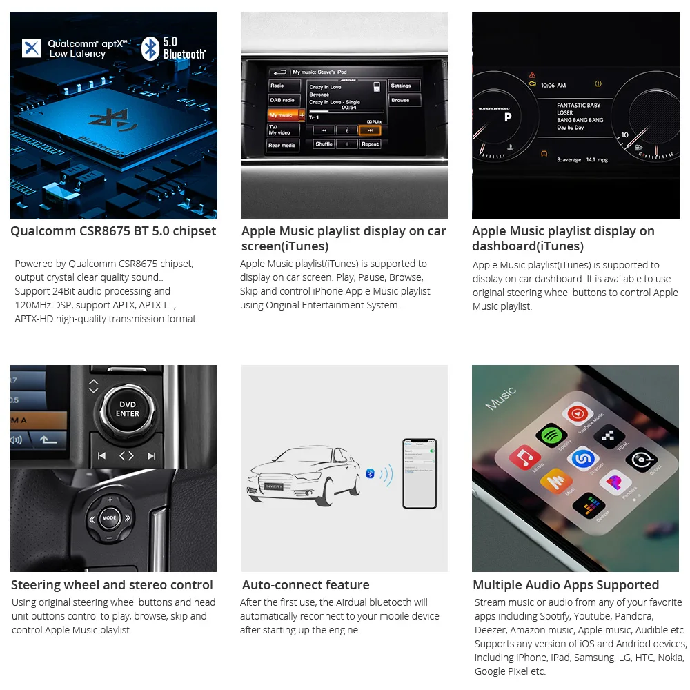 -[Обновите свой автомобиль с помощью потоковой передачи музыки BLUETOOTH] совместим с Land Rover, Range Rover, Jaguar 30 pin широкий старый разъем для подключения iPod. Не поддерживает телефонные звонки.- [PLUG, PAIR, PLAY] Просто подключите наш адаптер в разъем для подключения iPod, который обычно находится в перчаточном ящике или центральной консоли, подключите bluetooth, затем вы можете наслаждаться потоковой передачей музыки по bluetooth.-[Поддержка кнопки управления песней на рулевом колесе] с помощью кнопок рулевого управления для управления музыкой на предыдущих/следующих треках.-[Поддержка головного блока управления кнопками радио] с помощью кнопок головного блока радио для управления музыкой. Поддерживает только отображение списка воспроизведения Apple Music, не поддерживает отображение списка воспроизведения Spotify/Pandora. Информация о песне дисплей ony поддерживается для iPhone, не поддерживается для Android.-[Питание от чипсета QUALCOMM CSR] используется мощный Чипсет Qualcomm CSR, превосходящий кристально чистый качественный звук.
