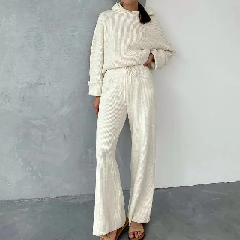Пижама женская трикотажная в рубчик, с капюшоном и широкими штанами