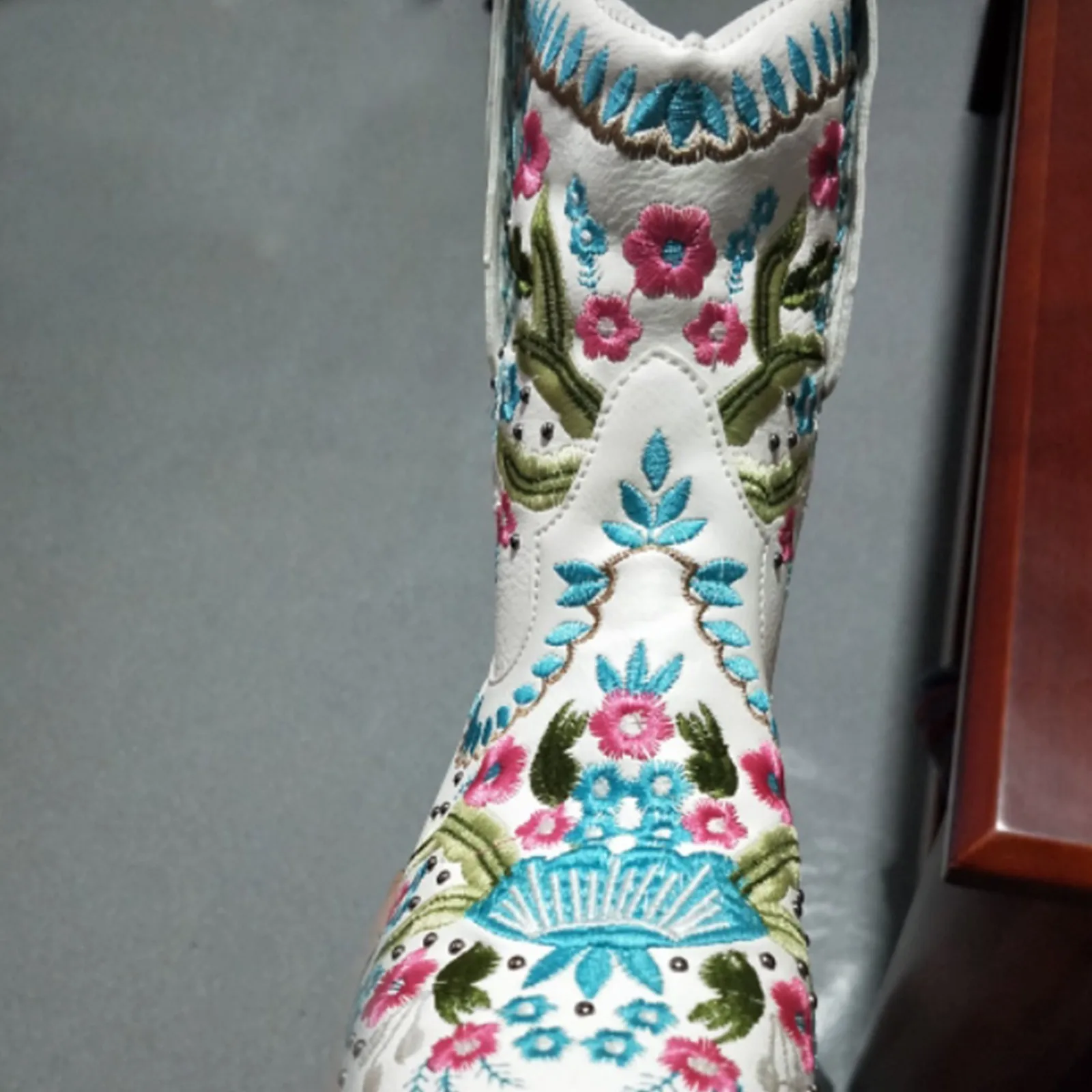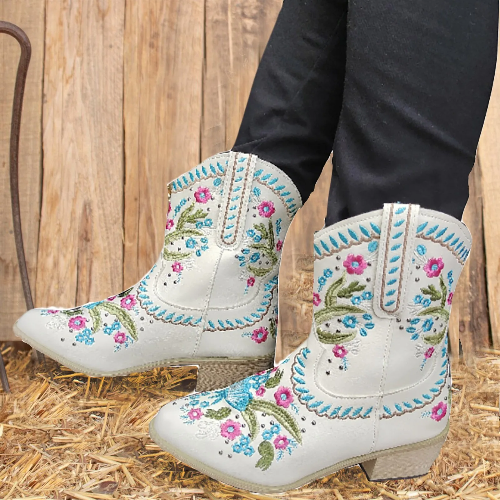 Женские рыцарские сапоги на низком каблуке с вышивкой; Ковбойские женские сапоги