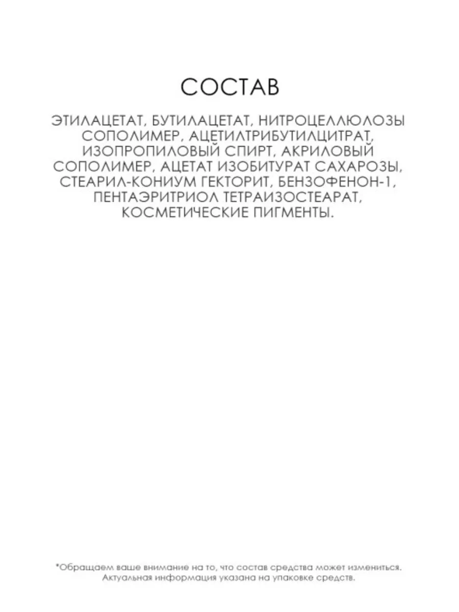 Способ применения: Нанести 1-2 слоя на чистые сухие ногти, дать подсохнуть.