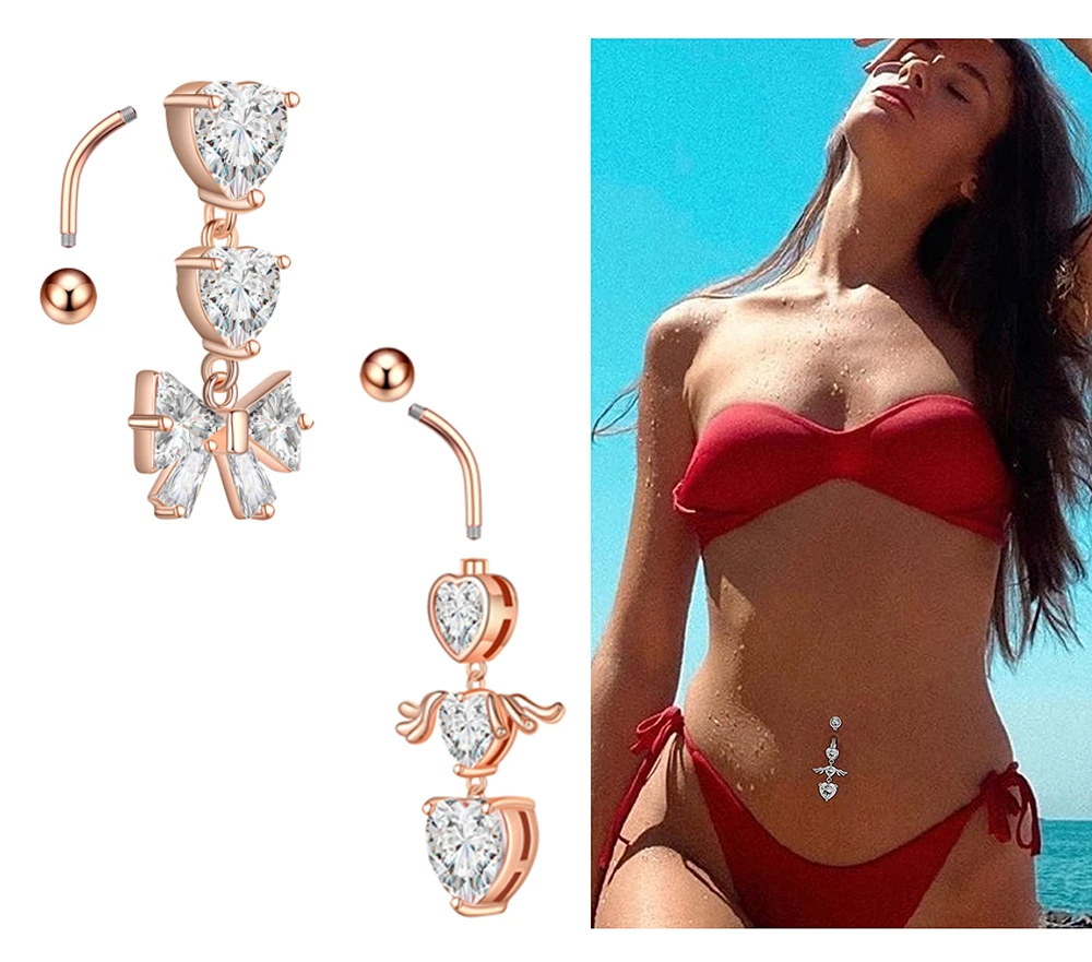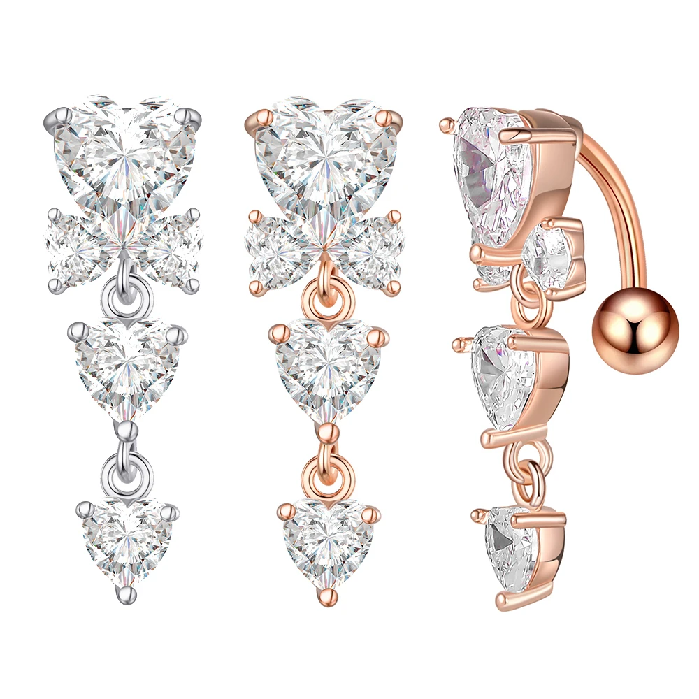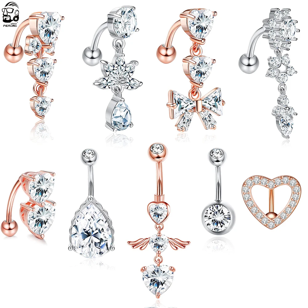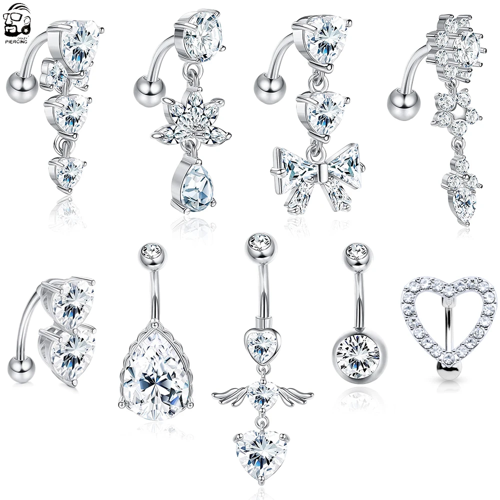 Изогнутые кольца для пупка 14G с обратным вырезом, свисающее сердце, прозрачные CZ кольца для пупка, хирургическая сталь 316L, Пирсинг живота